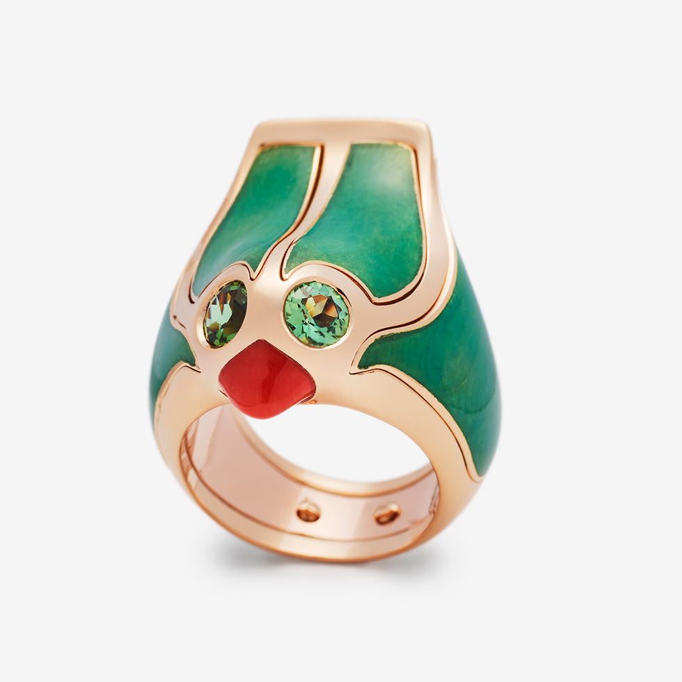 Vögeli Ring 4/4 In Roségold 750 mit grünen & blauem Email, eingeschliffenen Korallen und grünen Turmalinen