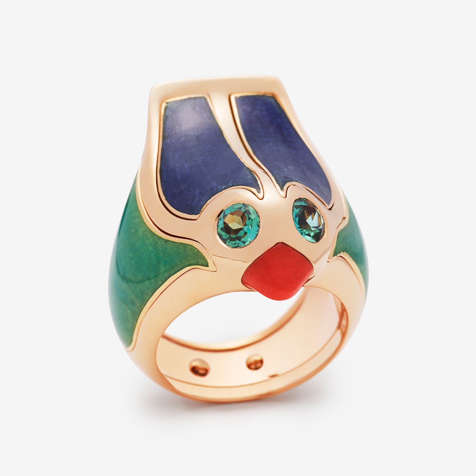 Vögeli Ring 3/4 In Roségold 750 mit blauem & grünem Email, eingeschliffener Koralle und grünen Turmalinen